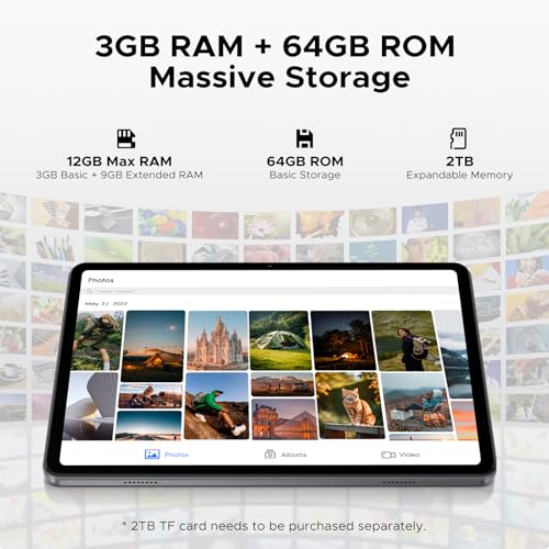 - 【12GB RAM & 64GB ROM & 2TB Expandable】Equipped with 12GB of RAM, including 3GB of base memory and an additional 9GB of expandable memory, this android tablets run smoothly with the latest Android 15 system. It handles multitasking with ease, providing a seamless user experience. The 64GB internal storage can be expanded up to 2TB via Micro SD, allowing you to store a vast number of apps, movies, music, and files without worrying about running out of space.
