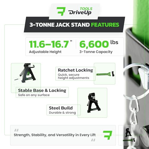 DRIVEUPTOOLS Axle Stands 3 Tons with Rubber Pad | Stabilizing Jack Stands Pack of 2 | Lifting Height 11.6-16.7 Inches | Car Lift | Heavy-Duty Car Stands 3 Tons (6,600 lbs) | Durable Axle Stands (x2)