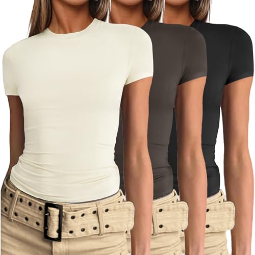 Ekouaer Womens 3 Pack Short Sleeve Tops Crew Neck Basic T-Shirts Stretch Fitted Summer Crop Top Aesthetic Streetwear, Black + Beige + Brown, XL