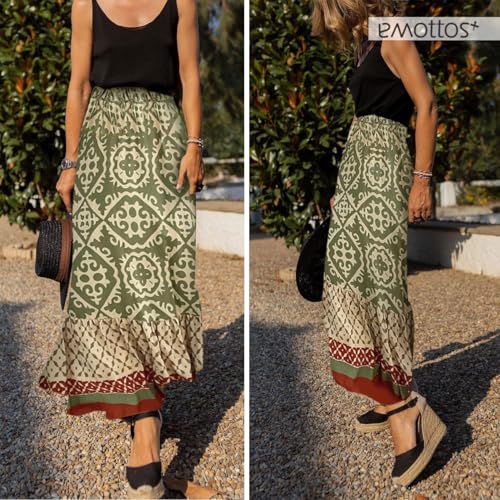 EMOTTOS Women Maxi Skirts Summer, Boho High Waist Bohemian Pleated Skirt, Floral Print with Ruffles, Drawstring, Elasticated A Line Summer Casual Elegant, Green XL