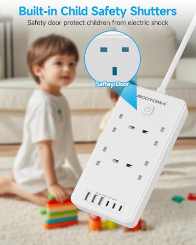 - 【10-IN-1 Extension Lead with USB Slots】This white extension lead is designed with 4 AC outlets, 3 USB-A & 3 USB-C slots, allowing you to charge 10 devices simultaneously. Max capacity up to 3250W (250V/13A) for high wattage kitchen and home appliances, such as kettle, microwave oven, hair dryers, and more