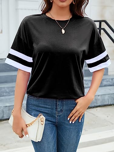 Famulily Striped T Shirt Casual Round Neck Half Sleeve T Shirt Women Loose Fitting Baseball Tops Black XXL