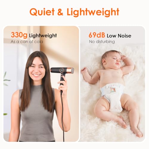 - 【Low Noise 69dB & Feather-Light 330g Design】Engineered with a brushless motor to keep sound under 69 dB, ideal for quiet home or salon use. Weighing only 330 g (similar to a smartphone), this dryer minimizes arm strain during long styling sessions, making it perfect for professional stylists.