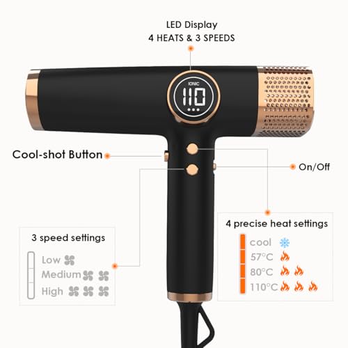 - 【12 Custom Settings with Clear LED Display】Features 4 temperature levels (natural/57 °C/80 °C/110 °C), 3 fan speeds (low/medium/high), plus a dedicated cool shot button. The bright LED screen makes it simple to choose the right mode for any hair type or style.
