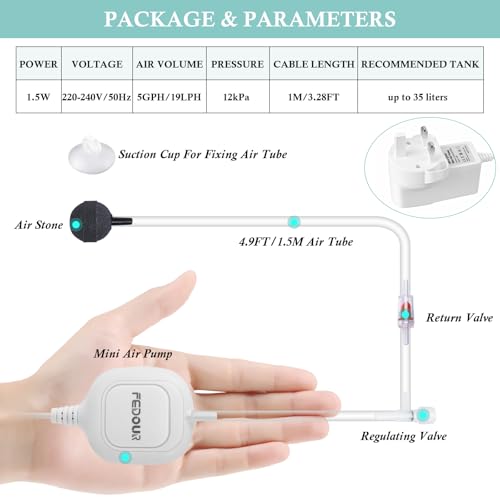 - 【Package】Comes with all necessary accessories, including 1.5M Air Tube , Air Stone, Check Valve, Regulating Valve, 1 Suction Cup for fixing the air pump, and 1 Suction Cup for fixing the air tube. If you have any questions, please feel free to contact us, our after-sales service team will solve your problem within 24 hours.