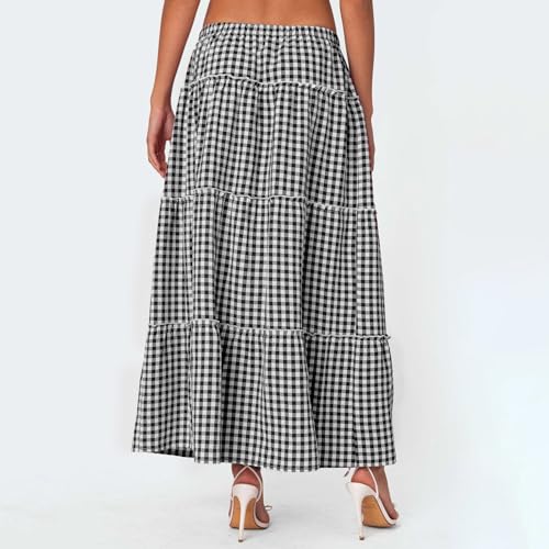 FeMereina Women Summer Plaid Print A-Line Skirt Casual High Split Elastic Waist Long Skirt Boho Gingham Flowy Skirts (Black, L)