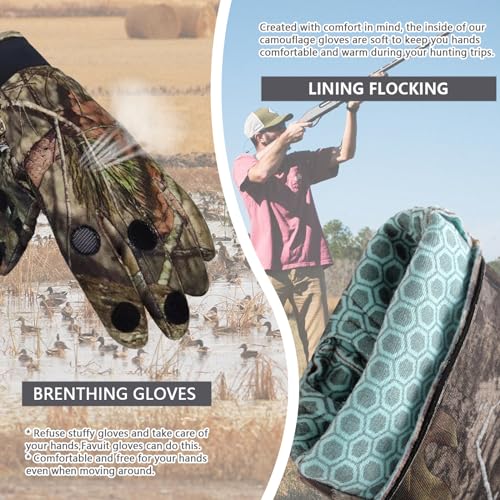 - đ§¤ăLightweight Camo Glovesă The camo gloves are made of 100% polyester ultra-lightweight material,breathable fabric that is sweat absorbing while remaining durable,wears very soft and comforable.Surface water repellent layer easily withstands outdoor rain or wet weather,the water will automatically condense into beads and slide off when you shake it,keeps your hands dry and comfortable at all times(although the fabric of shell is waterproof,it isn't suitable for using in the rain for a long time or immersing into the water).