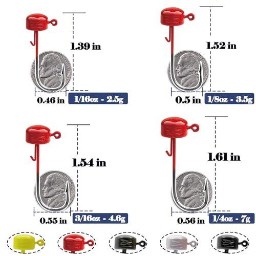 - Various options: Five colors (mixed), four sizes (1/16oz, 1/8oz, 3/16oz, 1/4oz) often meet your needs with different color worm bait.Make sure the bait vividly displayed in the water.