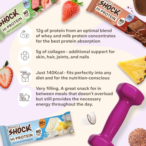 FitnesSHOCK High Protein Bar Mix Box, 12g Protein, Low Carb, No Added Sugar, 5g collagen, Fiber-Rich, Low Calorie 140 Kcal, Strawberry, Coconut-Pineapple, Chocolate 12x40g