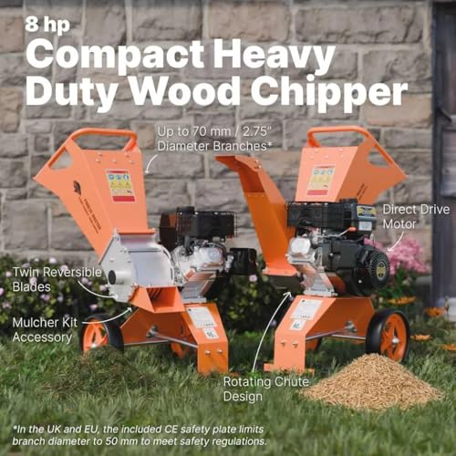 FM8DD Compact Petrol Wood Chipper – 8HP Engine for Garden Waste – Handles Branches Up to 70mm* – Direct Drive System with Anti-Block Design – UK Engineered (Chipper)