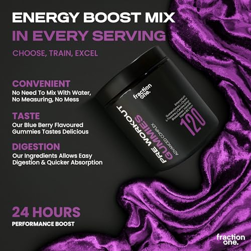 Fraction One Pre Workout Gummies – 120 Gummies – Energy Focus Support Complex With Guarana, L Theanine, L Citrulline, Vitamins B6, B12 & Niacin Performance & Endurance – Berry – Vegan – 60 Days Supply