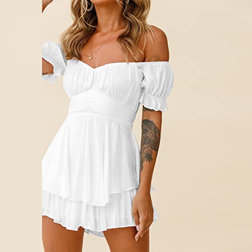 FYMNSI Women's Summer Jumpsuit Elegant Off Shoulder Cocktail Party Festive Jumpsuit Trouser Suit Playsuit One-Piece Short Romper, White, S