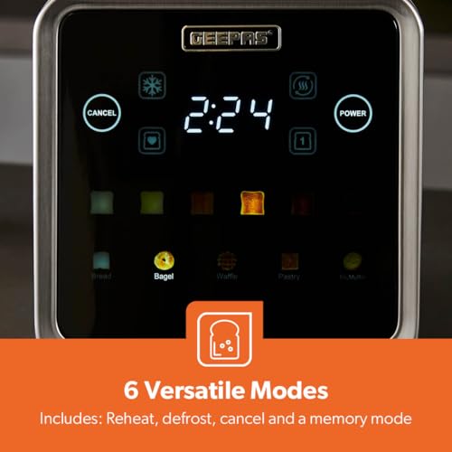 GEEPAS 5-in-1 DIGITAL 4 Slice Long Slot Toaster | Stainless Steel Housing, Extra Wide Slots LED Display & Timer | 6 Browning Level Cancel Defrost & Reheat Function Removable Crumb Tray | 1450W Silver