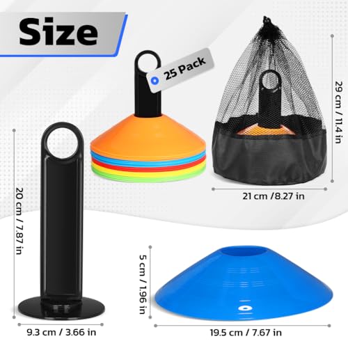- Lightweight and hard-wearing: 25 soft flexible cones in 5 different bright colours and supplied on a holder and in a mesh bag. Easily carried and easy to clean. Durable and won't crack or fade, fine workmanship, and can be used repeatedly