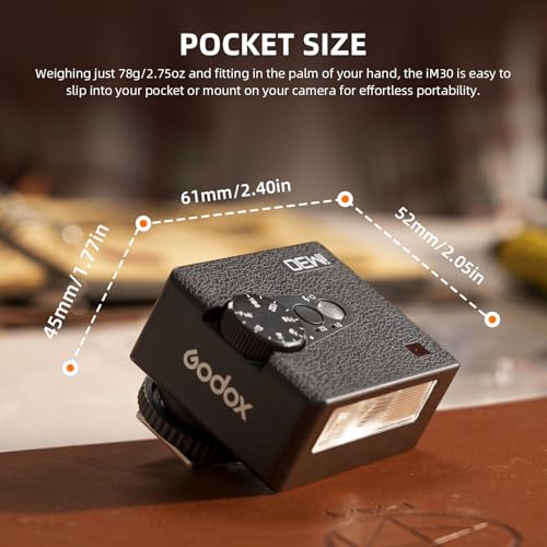 - Pocket Size Flash: Godox iM30 flash weighs only 78 grams and fits in the palm of your hand. It can be easily slipped into your pocket or mount to your camera, ultra portable for carrying. Just attach and start shooting, suitable for a wide range of shooting scenarios.