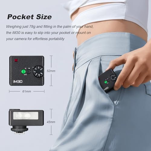 - Efficient Power Management – Powered by two AAA batteries, the iM30 delivers up to 230 flashes on a single charge, ensuring reliability and consistent performance throughout shoots.(Batteries need to be purchased separately.)