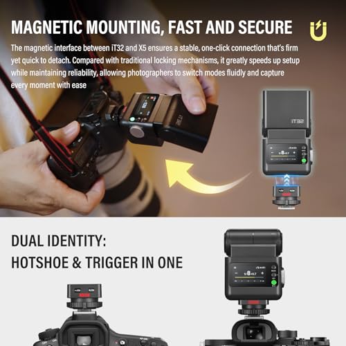 - ✨【iT32 & X5 Flexible Combination, Intelligent Adaptation】Godox iT32 and X5 connect via magnetic attachment,enabling swift detachment without manual pairing.Switch effortlessly between on-camera and off-camera modes for efficient creativity anytime,anywhere.The iT32 features a trigger detection function,recognising different hot shoe models of the X5 trigger.This enables seamless switching between multi-brand cameras without additional operations.Simultaneously,the iT32 lamp body displays information such as the X5 trigger model and charging status.