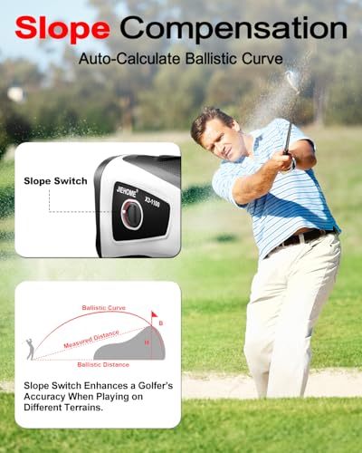- [Golf Rangefinders with Slope] Our golf yardage rangefinder comes with advanced slope compensation technology. It can measure the angle of incline/descent according to the elevation change, and then calculate the adjusted slope distance. The slope switch button on the side allows you to manually turn on or off the slope compensation feature, which is easy to use and for tournament legal.
