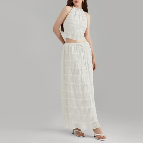 GPLOPEEY Summer Long Skirt Set for Women Backless Ruffle Halter Neck Top with Elasticated Waist Maxi Skirt Casual 2 Piece Outfits Y2k Beachwear (02 White, S)
