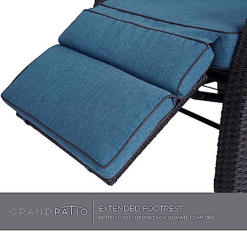 Grand patio Recliner Sun Lounger Adjustable Position Backrest Armchair with Flip Table and Cushion Lounge Chair Sunlounger for Garden, Yard, Patio, Outdoor – Peacock Blue Cushion & Brown Wicker
