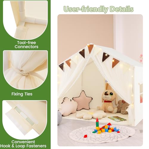 GYMAX Kids Play Tent, Indoor Large Play House with Padded Mat, Door Curtains, Windows, Star Lights & Flags, Toddler Fairy Castle Tent for Girls Boys Gift (Beige)
