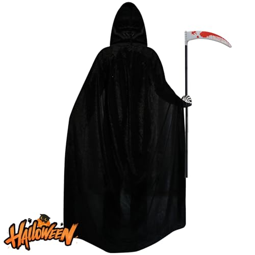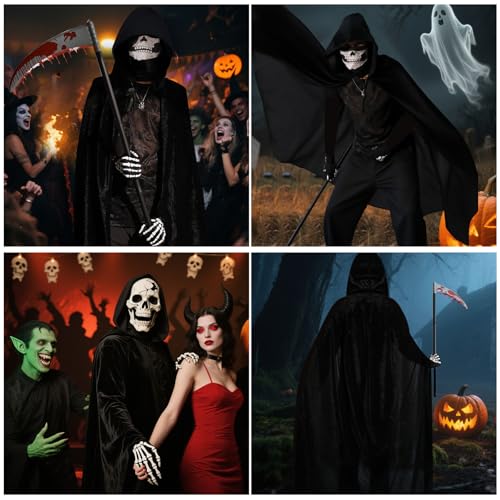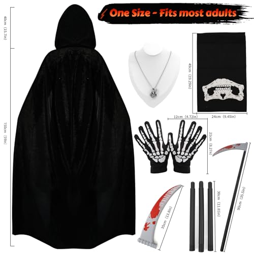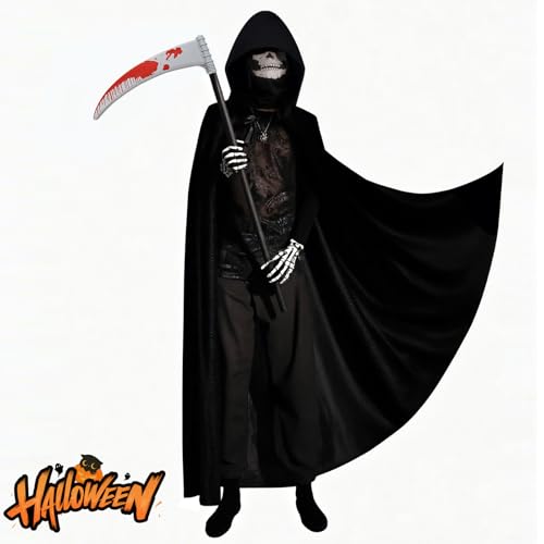 The long cloak (150 cm, not including hood) fits most adults between 1.7m and 2m tall, making it versatile and comfortable. The scythe is lightweight and easy to assemble or disassemble, so you can transport it with ease. The skull mask and skeleton gloves are crafted from soft, durable materials that ensure you can wear them all night without discomfort.