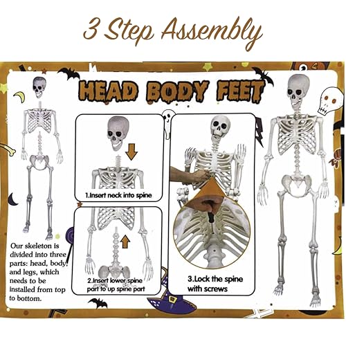 Assembly takes just a few minutes. The skeleton comes in three main parts—head, torso, and legs. Simply connect the spine pieces and secure with the included screws (a screwdriver is provided). Once assembled, you’ll have a sturdy, full-size figure ready to decorate your home or event.