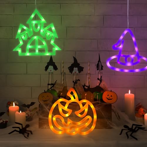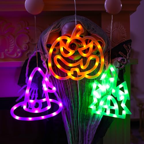 The Jsdoin 3 Pack Halloween Window Lights add instant festive magic to your home, shop, or party. Designed with vivid 3D Halloween shapes including a pumpkin, witch hat, spooky castle, cat, broom, and tombstone, these glowing decorations create a fun and playful atmosphere perfect for kids and families.