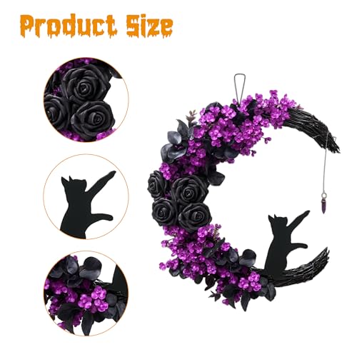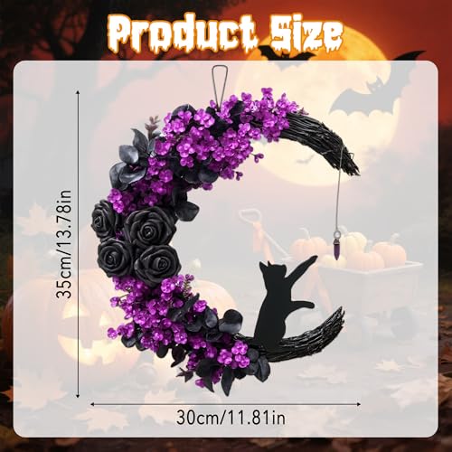 Halloween Moon Wreath for Front Door: Moon Wreath with Black Cat and Rose Grapevine Garland Cat Door Wreath Gothic Decorations for Home Party Window Wall Indoor Outdoor (35x30cm) (Purple)