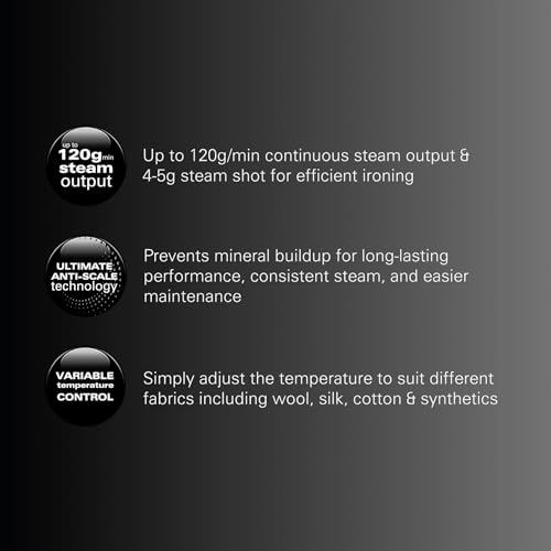 • 120g/min continuous steam output and 4-5g steam shot for effortless wrinkle removal