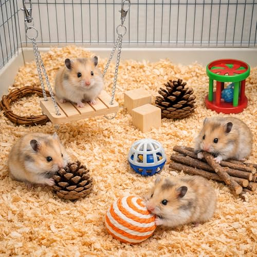 - Fun-filled experiences: 11 gerbil toys, including a variety of chew toys and delightful, adorable playthings for your pet to enjoy. Let your little companion swing, toss, gnaw, frolic and vie for these delightful items