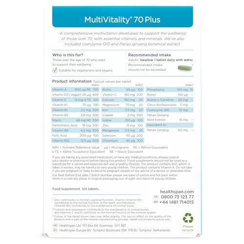 WHY CHOOSE HEALTHSPAN? It contains quite a lot of vitamins, minerals, and other important nutrients, including co-enzyme Q10, ginseng, bioflavonoids and acetyl L-carnitine to safeguard the nutrition of anyone over the age of 70. Just one tablet daily of this comprehensive multivitamin supports your brain, bone, heart, and immunity health, in addition to your muscles and energy metabolism.