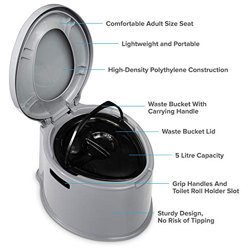 - HILLINGTON LIGHTWEIGHT AND PORTABLE 5L CAMPING TOILET – A fantastic and highly popular basic toilet unit designed for camping, caravan or outdoor use, as well as a spare toilet during home renovations. Simple, easy to use and easy to empty, the Hillington 5L Camping Toilet offers a stylish and functional design and necessary practicality