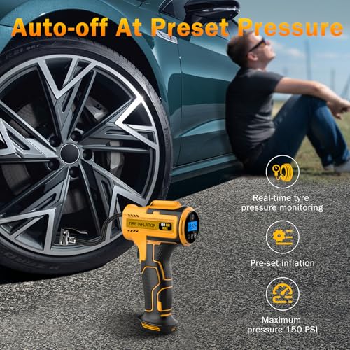 Tyre Inflator Air Compressor, Portable Cordless Tyre Pump with Digital Pressure Gauge 150PSI, Electric Car Air Pump Auto Shutoff with LED Light for Car Motorcycle Bicycle