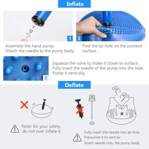 - Details: The blue wobble cushion measures 33 cm and is made of 100% ergonomic, non-slip and skin-friendly PVC. The delivery includes a needle air pump, which you can use to inflate the wobble cushion and adjust the air pressure in it