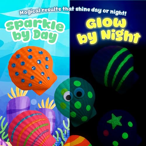 - Complete Creative Set – Everything needed in one box: 10 large polished shells, colorful rhinestone sticker sheet, googly eyes, 3 glitter glue pens (red/green/blue), 3 glow pens (green/purple/yellow), clear glue, 6 paint colors, paint tray, and 2 fine-tip brushes.