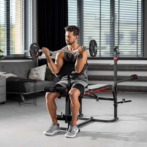Hop-Sport Folding Weight Bench HS-1065 – Adjustable Workout Bench with Barbell Rack, Preacher Curl Pad, Butterfly Arms & Leg Developer for Strength Training & Bench Press