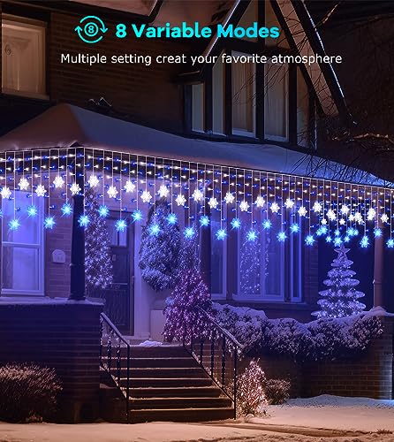 - 【Timer & Memory Function】You don't need to worry about opening the icicle lights and forget to close. Our Snowflake Icicle Lights are with 3 timer functions. You can freely choose 6H ON &18H OFF / 8H ON &16H OFF / 6H ON & 6H OFF & 3H ON & 9H OFF. Allows you to save time and effort! Built-in memory function, the lights will remember what you set last time, very convenient