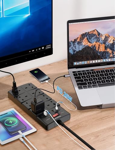 - USB Fast charge Extension Lead: Built-in intelligent IC, which can detect your devices and automatically deliver the optimal current to USB Powered devices, 2 USB-C charging ports support PD20W fast charging, 2 USB-A charging ports support up to 18W,Compatible with iPhone 16/15/14, iPad Pro/Mini.