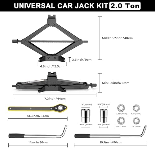 - 👍【 WHAT YOU GET 】2T Scissor jack x 1; Ratchet Wrenchx 1; Lug Wrench(17/19mm 21/23mm) x 1; Storage Bag x 1. all-inclusive Tools fit perfectly in your trunk or garage, ready to tackle any emergency tire replacement job.