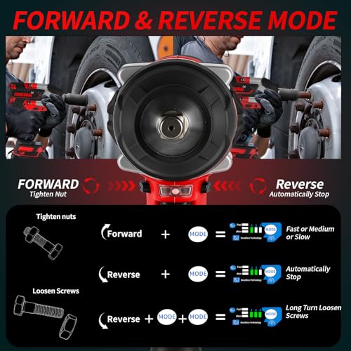 - Two Directions & Brake-Stop: this electric impact wrench can cooperate with locking protection, forward and reverse modes. The clockwise or anti-clockwise rotation can be achieved by adjusting the side button. In reverse mode, once the nut or bolt is loosened, the brake stop device will activate and reduce speed and torque to protect the nut from flying into nowhere to catch
