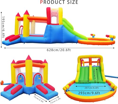 - 【Rich Gameplay】Bouncy castle with four slides is full of children's fun, ultra-wide climbing wall, trampoline, 2 water sprays, 2 water cannons, oversized shallow pool, and double racing slides for kids to enjoy entertainment and play. Children can experience climbing, weaving, sliding, jumping and swimming in a variety of ways to give their bodies a full workout. Let them enjoy a different kind of water party. The colourful castles allow children to be embraced by a wonderful fairytale world.