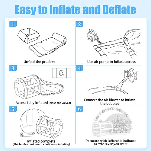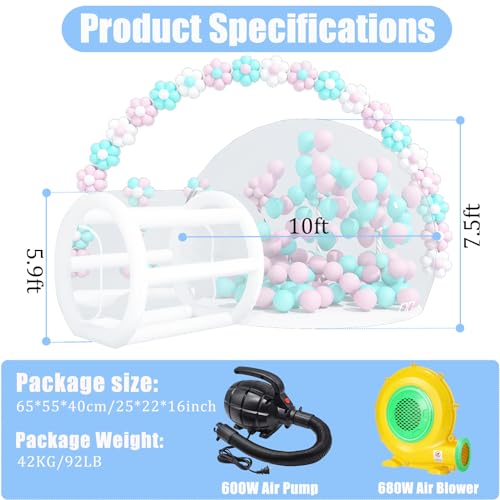 - EASY TO INFLATE AND DEFLATE The inflatable bubble house is equipped with a 680W air blower and a 600W electric air pump.No complicated assembly required, the large fan is used to continuously inflate the bubble house, and the small air pump is used to inflate white pillars, all can be completed in three minutes.