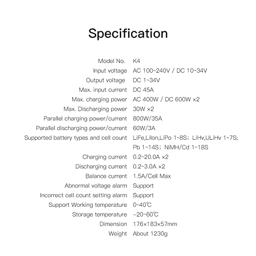 - ▶【AC/DC Dual Modes Lipo Charger】:Our lipo charger has AC 400W/DC DC600Wx2 dual input model with Independent dual channel,charging current:30AX2,Max.Input current:60A.Advanced crafty cooling air duct for high efficiency heating dissipation.K4 can acquire latest firmware upgrading,ensure the charger have optimalized performance and latest firmware all the time.
