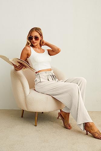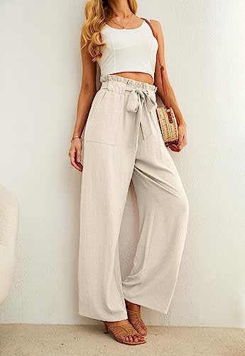 IWOLLENCE White Wide Leg Trousers for Women UK Palazzo Trousers Elasticated High Waist Ladies Work Casual Pleated Paperbag Pull On Trousers