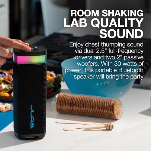 JLab JBuds Party Portable Bluetooth Speaker with 12H+ Playtime – 30W Wireless Outdoor Travel Speaker with RGB Lights & Lab Quality Sound, IP56 Water Resistant Speakers, Black