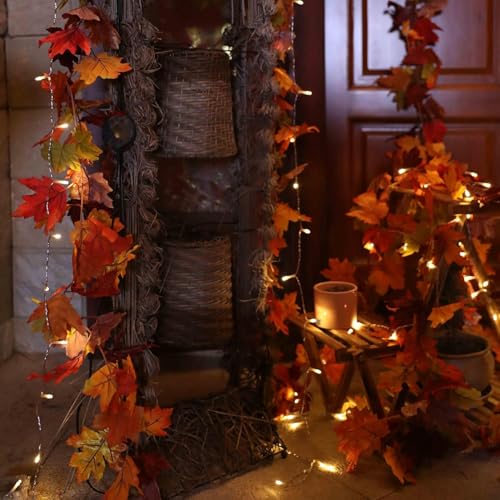 - Full autumn garland with light set:Includes 2 packs of autumn garland, each 5.8ft long with 72 vibrant autumn leaves, plus 4 sticky hooks. An ideal bundle for quick and beautiful autumn decor, perfect for doorways, fireplaces, or holiday centerpieces.