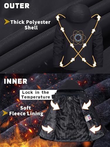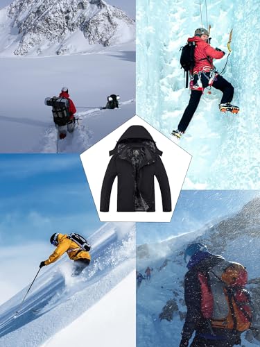 KEFITEVD Mens Winter Waterproof Jacket with Hood Fleece Ski Jacket Warm Outdoor Windproof Sport Jackets Multi-Pockets Black XL