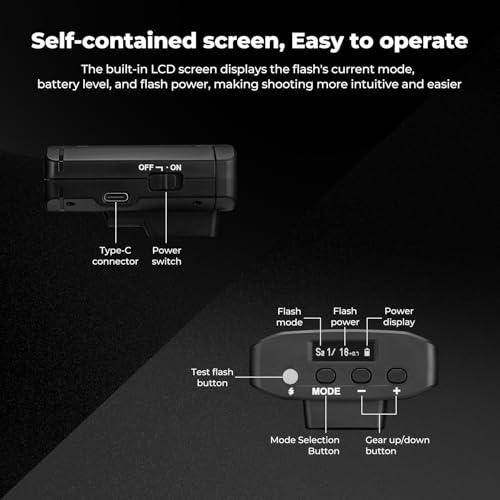 - 【User-Friendly Display】The built-in LCD screen clearly shows the flash mode, battery level, and flash power, providing an intuitive and straightforward operation experience.