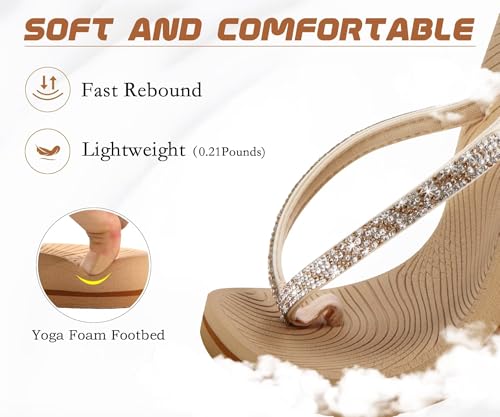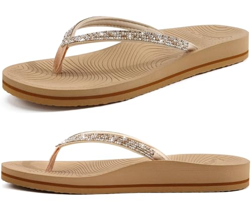 KuaiLu Women's Rhinestone Flip Flops with Comfort Arch Support Yoga Mat Cushion Sandals Fashion Summer Beach Pool Travel Orthotic Walking Thong Sandles Slip on Plantar Fasciitis Beige 6